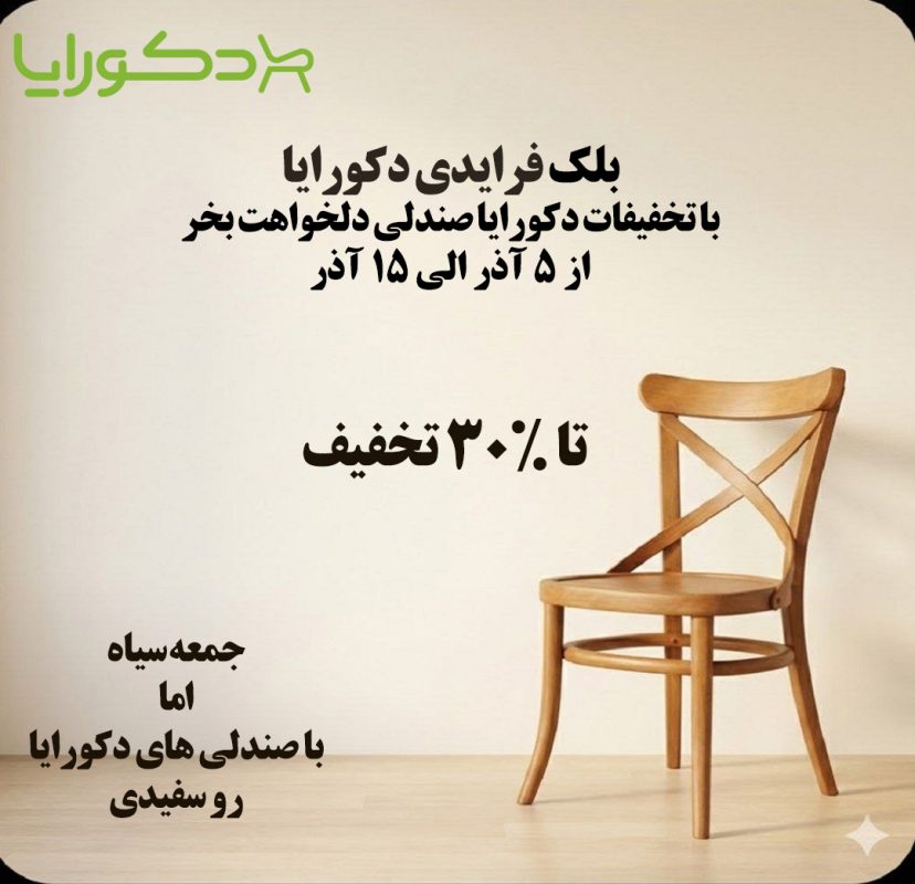 مجموعه دکورایا در بازه 05 آذر الی 15 آذر، با شما در بلک فرایدی همراه است.تنها با کلیلک بروی هر یک از بنرها، کدهای تخفیف برای تمامی شما مشتریان عزیز آماده است.برای مشاوره و خرید تلفنی با شماره 09351107780 تماس حاصل کنید.